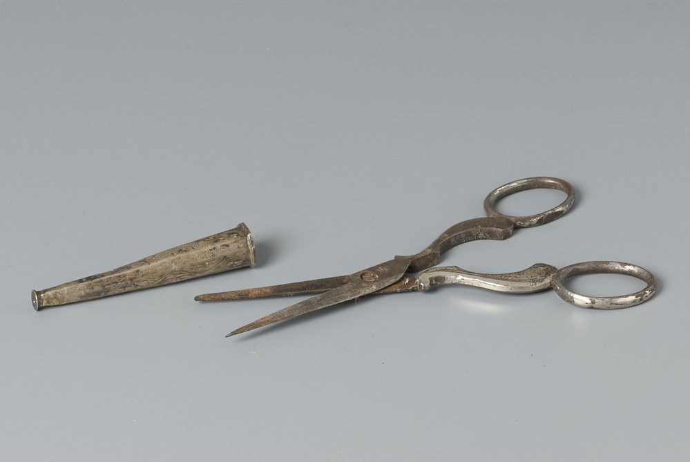 Kleine ijzeren schaar voor handwerk/ naaigarnituur met zilveren achtkantige schede gegraveerd.- Trefwoorden