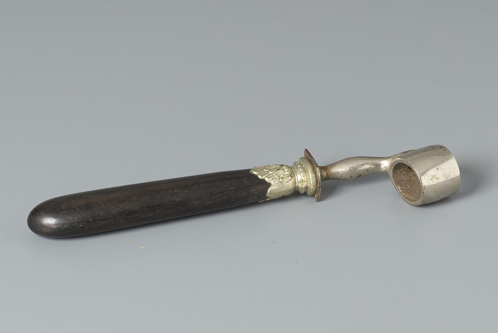 Ebbenhouten greep met vernikkeld opzetstuk, mogelijk dienend voor het presenteren van gebraad.- Trefwoorden
