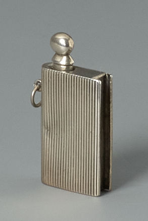 Doosje in boekvorm op de rug een oog met ring op de bovenzijde een ovaal strijkstokje met ovale knop.- Trefwoorden