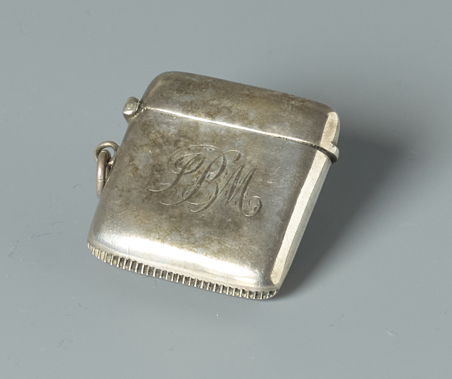 Plat luciferdoosje met scharnierend deksel, inscriptie: JBM- Trefwoorden