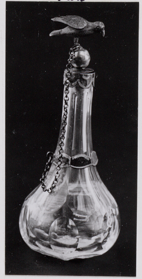 Kristallen karaf met olijfslijpsel, zilveren stop waarop een vogeltje met ketting aan poot.- Trefwoorden