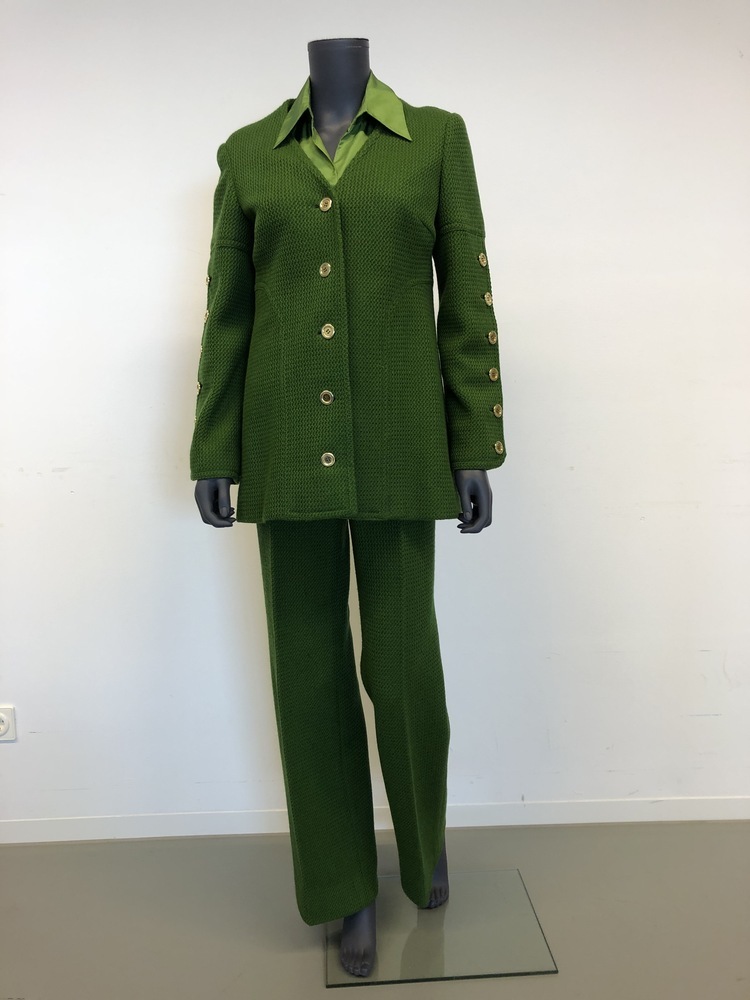 Kraagloze jas van gebreide wol met 5 gepaspelleerde knoopsgaten middenvoor en 5 goudkleurige knopen met tegenknoop. Twee tegenknopen zijn vervangen door een rond stuk groen vilt . Beide mouwen hebben een aangezet stuk met een valse split. De split heeft 6 gepaspelleerde knoopsgaten en 6 goudkleurige knopen. Belijning en splitten zijn doorgestikt. De jas is gevoerd met groene viscose. Bij de voorsluiting is er een witte bies meegenaaid. Het label van Dick Holthaus is rechtsvoor ingenaaid. De broek is van hetzelfde materiaal. Het model is recht met een ritssluiting middenvoor. en geperste vouw.