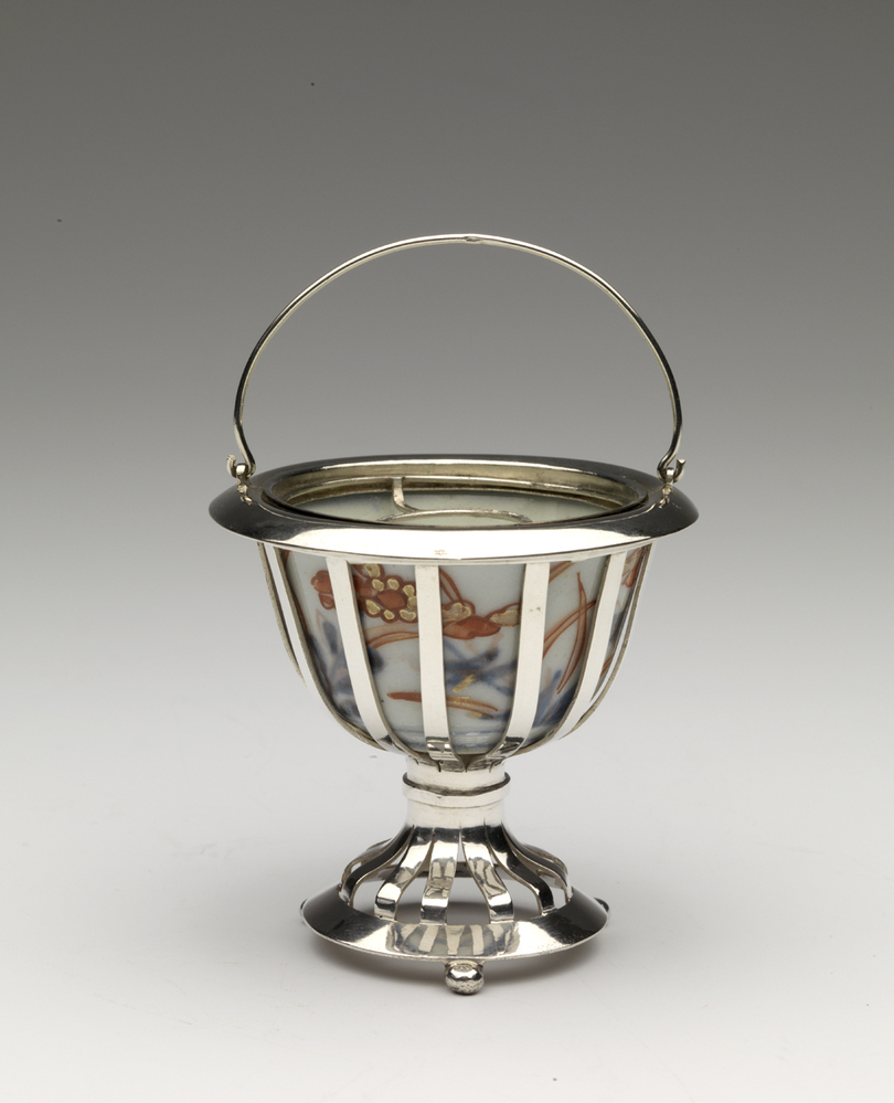 Komfoor voor theeketel met ronde uitgetrokken voet, spijlen en rand van zilver, porseleinen binnenbak met veelkleurige bloemdecoratie.