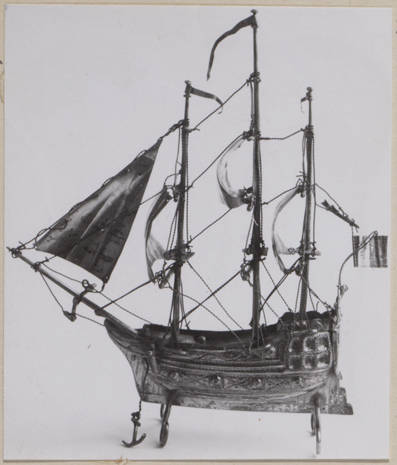 Driemaster, vol getuigd, naar 17de eeuws voorbeeld met hoogopgaande achterspiegel. Staande op vier gebogen pootjes.- Trefwoorden