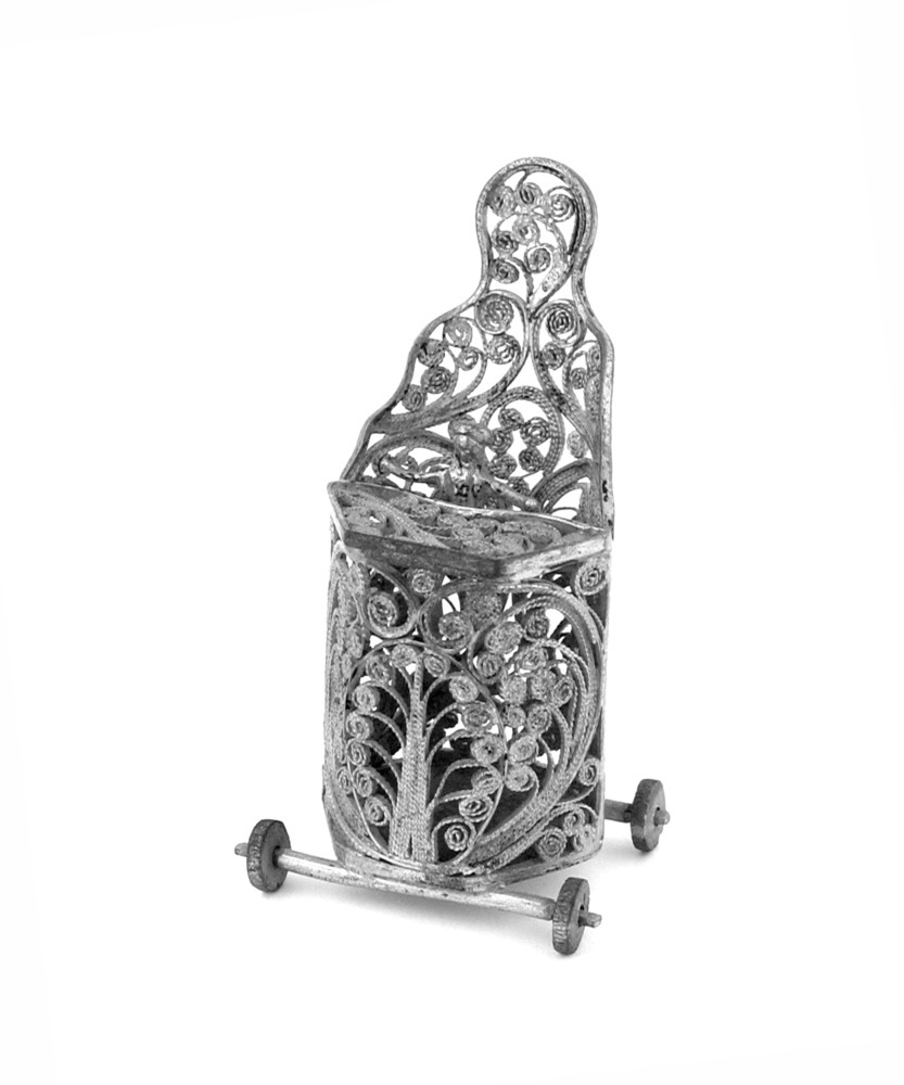Stoel van filigrain staand op twee rollen met vier wieltjes en met kind erin.- Trefwoorden