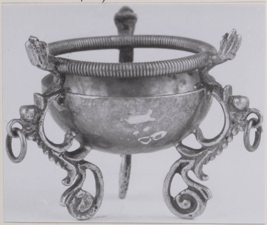 Rond komfoortje met voluten, ringen en koordrand, staande op drie pootjes.- Trefwoorden