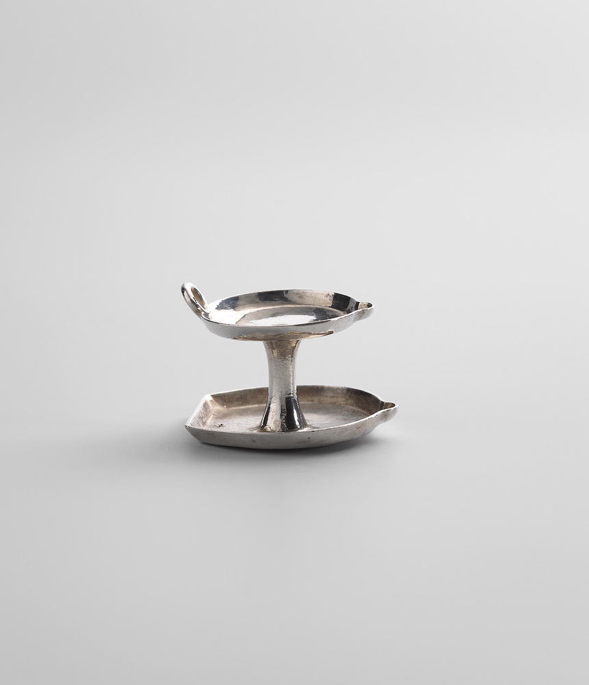 aardewerken voorbeeld tot in detail. De basisvorm bestaat uit een schotelvormige voet met daarop een stam en een wijd oliereservoirtje waarin de pit drijft. De tuit aan de voorkant diende als steuntje voor de pit. Dit soort lampen was altijd voorzien van een oor, zodat ze niet alleen konden staan maar ook hangen. ( Bert Vreeken)