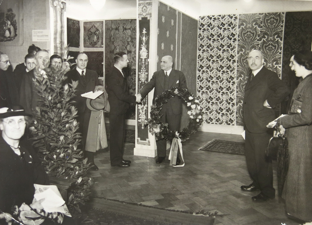Groepsfoto gemaakt op 16 oktober 1937 bij de uitreiking van een krans aan prof.dr. Heinrich Apell bij zijn 50ste persoonlijke rondleiding door de tentoonstelling 'Historische behangsels der 17e, 18e en 19e eeuw uit het Duitsche Behangselpapier-Museum te Kassel' van 4 t/m 20 oktober 1937 in de toonzalen van Rath & Doodeheefver N.V. aan de Prinsengracht te Amsterdam, 1937