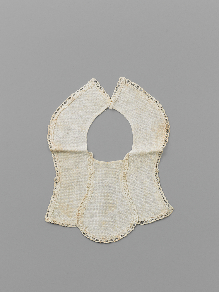 Witte slab van katoen met ingeweven patroon (met dikkere draad), afgezet met machinale open rand en op het middenstuk. Sluiting met trens en knoop, knoop ontbreekt