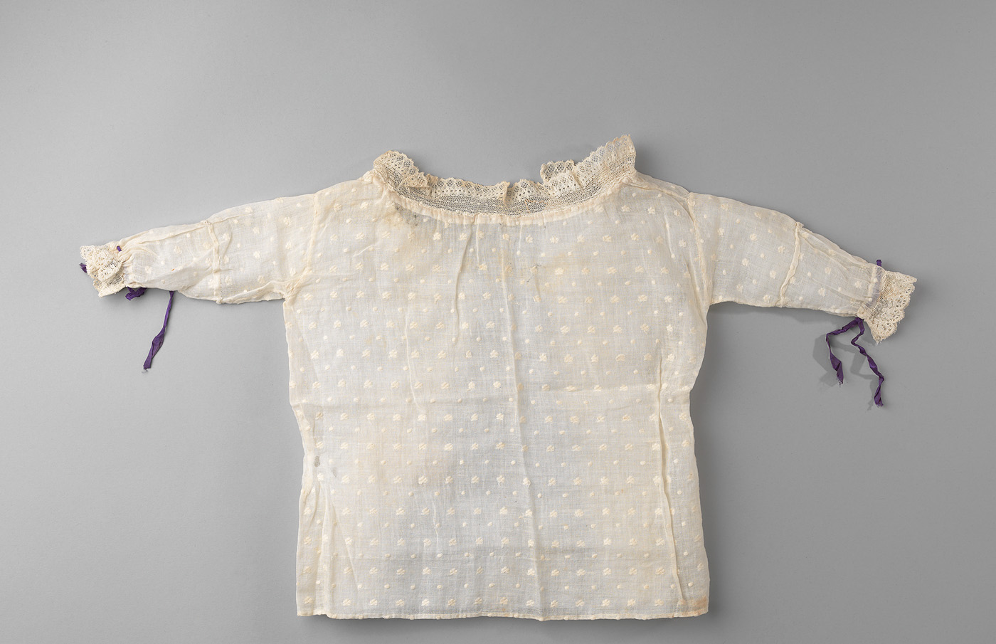 Hemdje met lange mouwen van genopt katoen met machinale kant langs hals en mouwen, en paarse lintjes. Vrij algemene stof. Oprijgje in mouwen. handgenaaid, maar niet heel netjes. Open aan de achterzijde. Niet voor kleine baby.