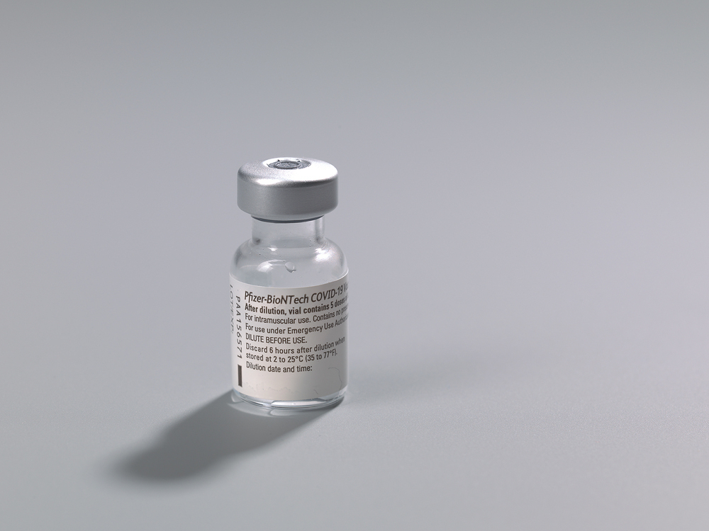 Flesje uit eerste batch mRNA-vaccin van Pfizer-BioNTech tegen COVID-19 dat in Amsterdam is toegediend op 6 januari 2021 aan het personeel 'in de frontlinie' - o.a. ic-medewerkers, ambulancepersoneel en personeel van spoedeisende hulp en de COVID-afdeling - bij het UMC, twee locaties, ca. 1000 medewerkers.