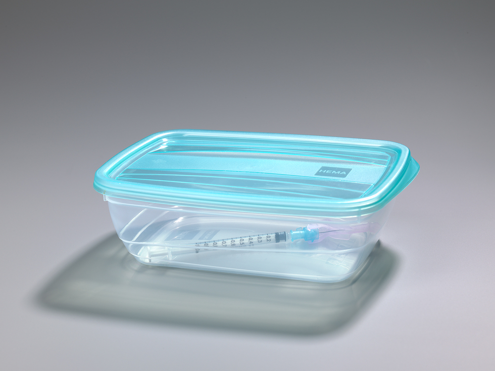 Vaccinatiespuit gebruikt voor eerste vaccinatie tegen Covid-19 in de RAI van het personeel van verpleeghuizen in Amsterdam e.o op 11 januari 2021, incl. HEMA-bakje gebruikt voor desinfectie en transport