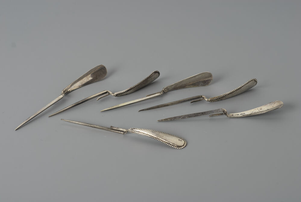 Speld of steker met driehoekige steel en een punt, geknikt met met daarin een korte stift en een spadel met parelrand- Trefwoorden