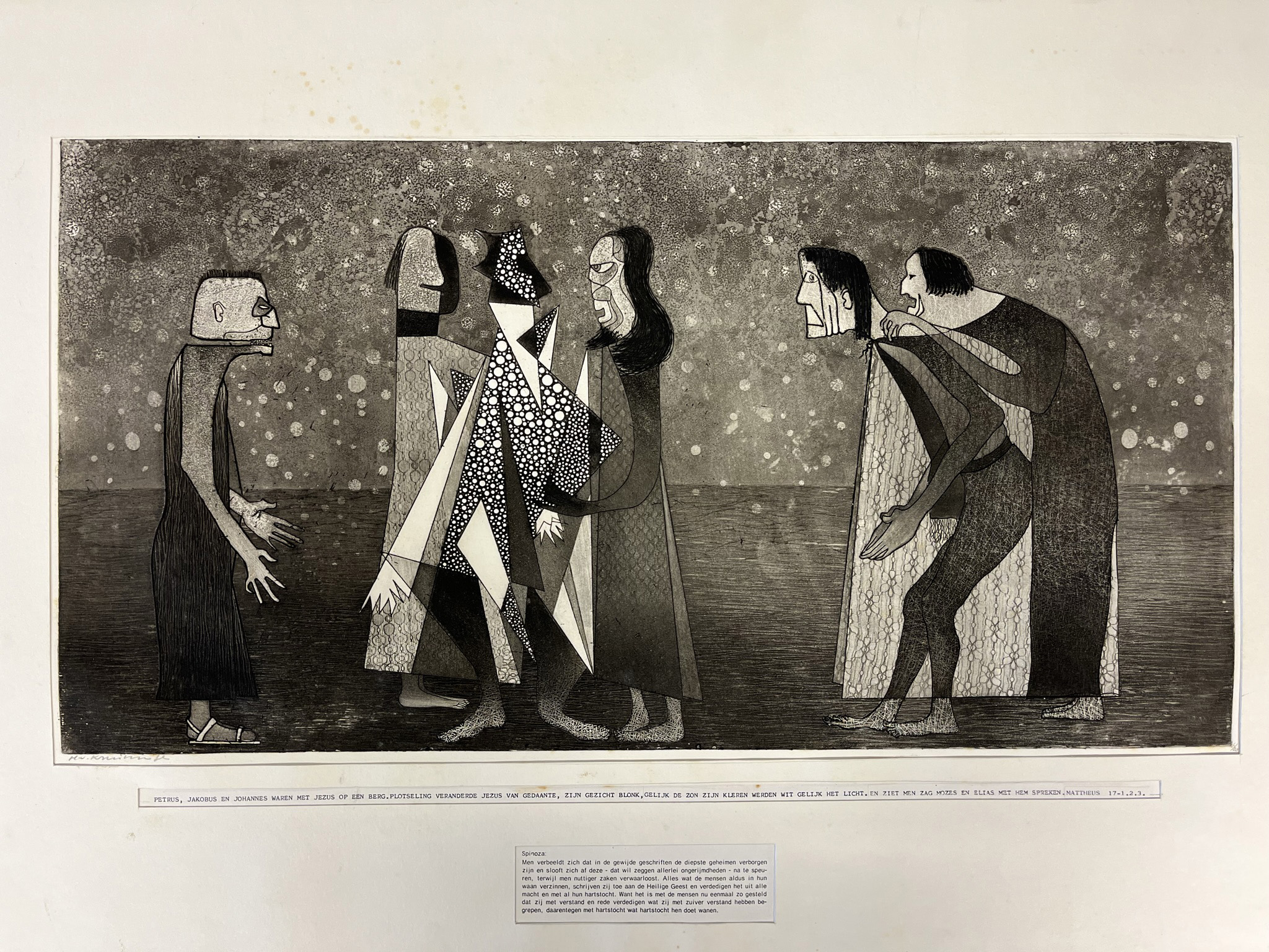 Eerste onderschrift, in kapitalen: "Petrus, Jacobus en Johannes met Jezus op een berg. Plotseling veranderde Jezus van gedaante, zijn gezicht blonk, gelijk de zon, zijn kleden werden wit gelijk het licht en ziet men zag Mozes en Elias met hem spreken. Mattheus 17 -1, 2, 3.".