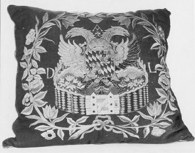 Opdrachten van overheden vormden een belangrijke bron van inkomsten voor de borduurwerker. Dit door het hoogheemraadschap van Delfland bestelde kussen is daar een voorbeeld van. Het centrale versieringsmotief bestaat uit een omheinde tuin (hier met bloeiende tulpen), de zogeheten Hollandse Tuin, symbool van de souvereiniteit van de Republiek der Zeven Verenigde Provinciën. De Hollandse leeuw die de tuin hoort te bewaken is hier echter vervangen door het gekroonde, door een tweekoppige adelaar gehouden wapenschild van het hoogheemraadschap met de gecombineerde wapens van de Hollandse graven uit het Hollands-Beierse huis. Het tuinmotief is omgeven door twee samengebonden takken met bloemen en bladeren. ( Bert Vreeken)