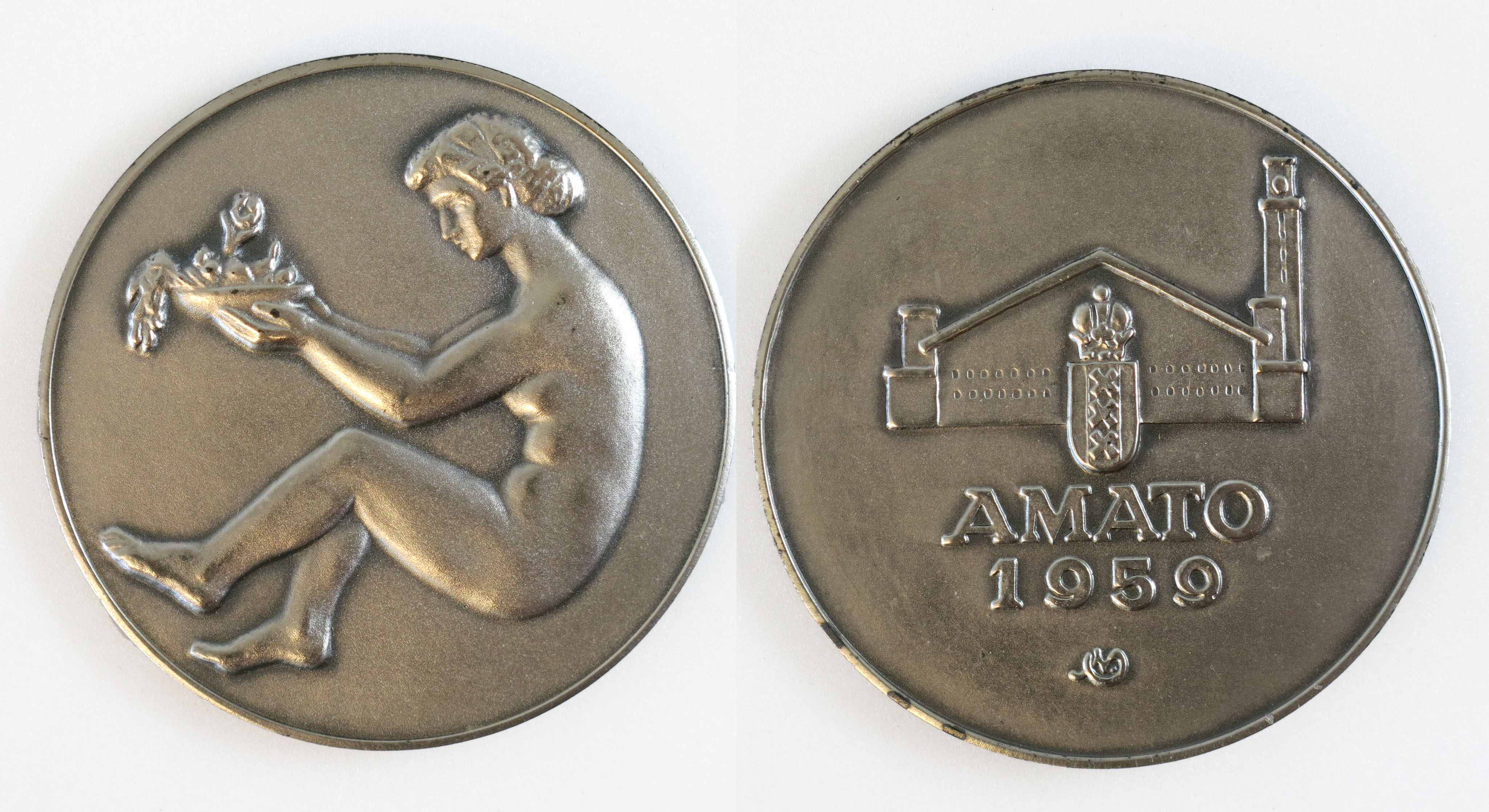 keerzijde: het gekroonde stadswapen van Amsterdam, waarachter het silhouet van de markthallen. Daaronder een opschrift. Onderaan een monogram.