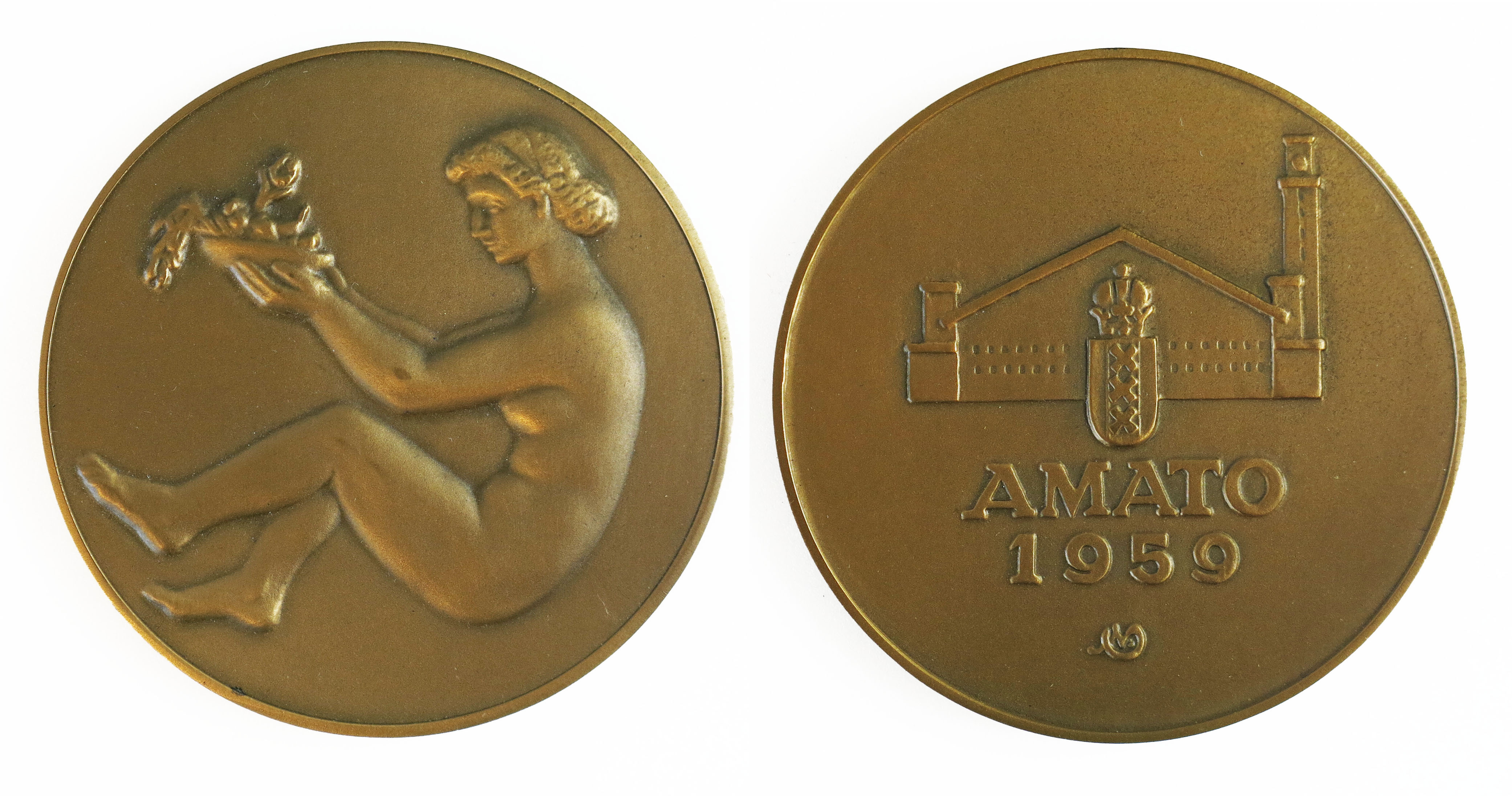 keerzijde: het gekroonde stadswapen van Amsterdam, waarachter het silhouet van de markthallen. Daaronder een opschrift. Onderaan een monogram.