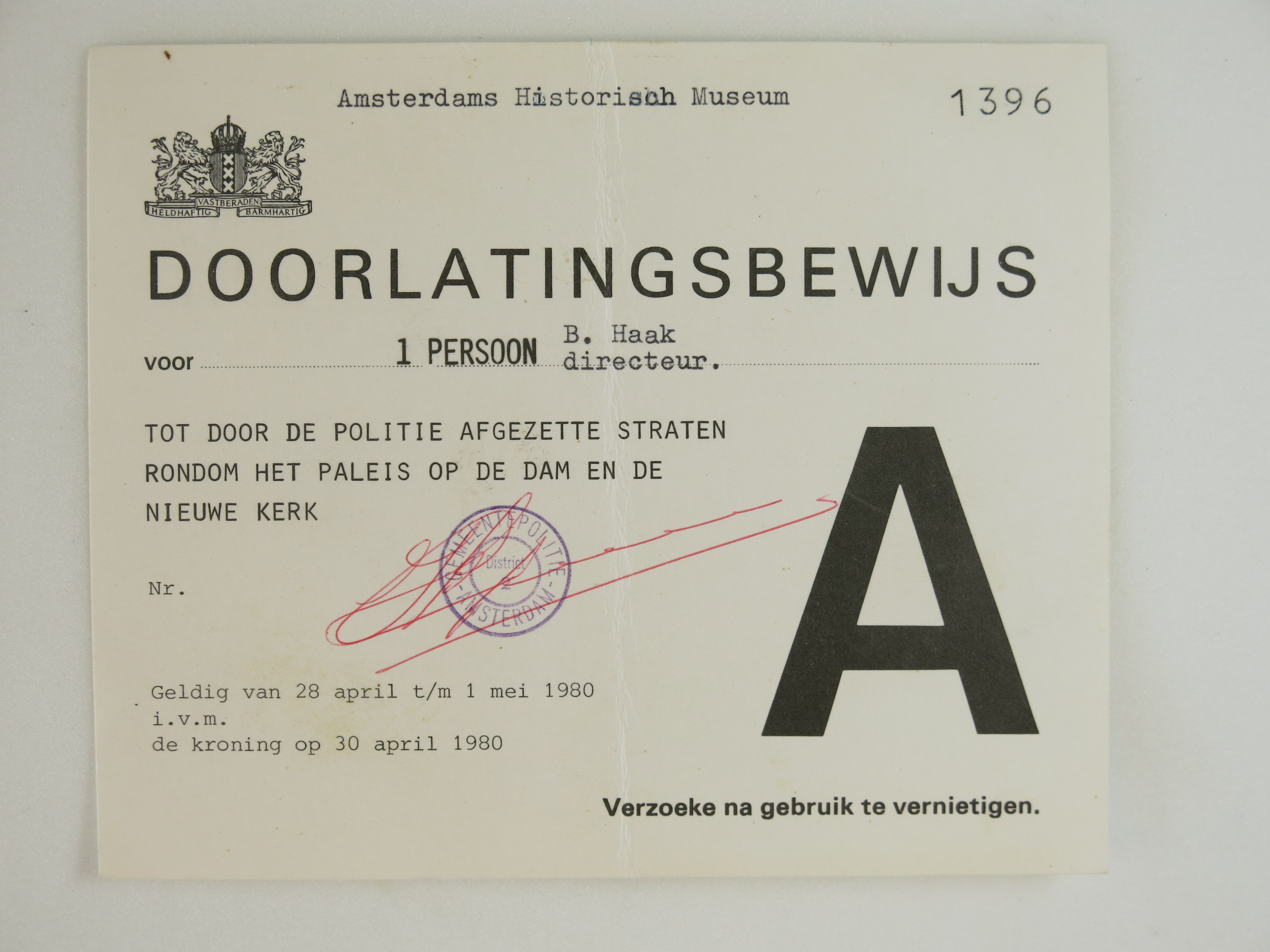 Doorlatingsbewijs tot door politie afgezette straten rondom het Paleis op de Dam en de Nieuwe Kerk, op naam van B. Haak, directeur Amsterdams Historisch Museum