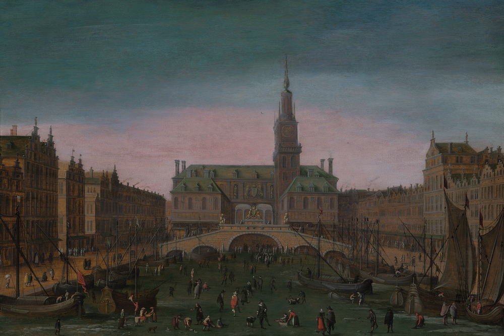 - Gezicht op de Oude Beurs vanaf het Rokin in de winter, met schaatsenrijders en andere figuren op het ijs, 1600 - 1625