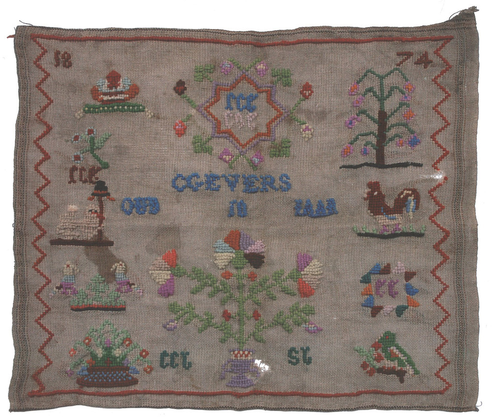 Deze doek lijkt in kleur en opzet op de Willem I-gedachtenisdoek van haar zus (inv.nr. 7127), alleen het formaat is wat groter. De doek meet 36,5 x 30 cm en is gevuld met tal van merklapmotieven. In het stermotief aan de bovenzijde van de middenas plaatst Catharina de initialen van haar ouders: FCE voor Frederic Casper Evers en CGE voor Catharina Gerarda Eijgensteijn. Daaronder borduurt ze haar naam CGEVERS en haar leeftijd, 10 jaar. Haar broer Frederic Casper Evers en Elisabeth Evers worden elders op de doek gememoreerd. Aan de bovenzijde, in de hoeken staat het jaar waarin Catharina deze doek heeft voltooid: 18 74. Ook dit werkje laat zien dat de familie Oranje gezind is. Links, op een grondje, staat de Nederlandse leeuw, die een lans of staf vasthoudt met daarop een zwart vrijheidshoedje met oranje lint.