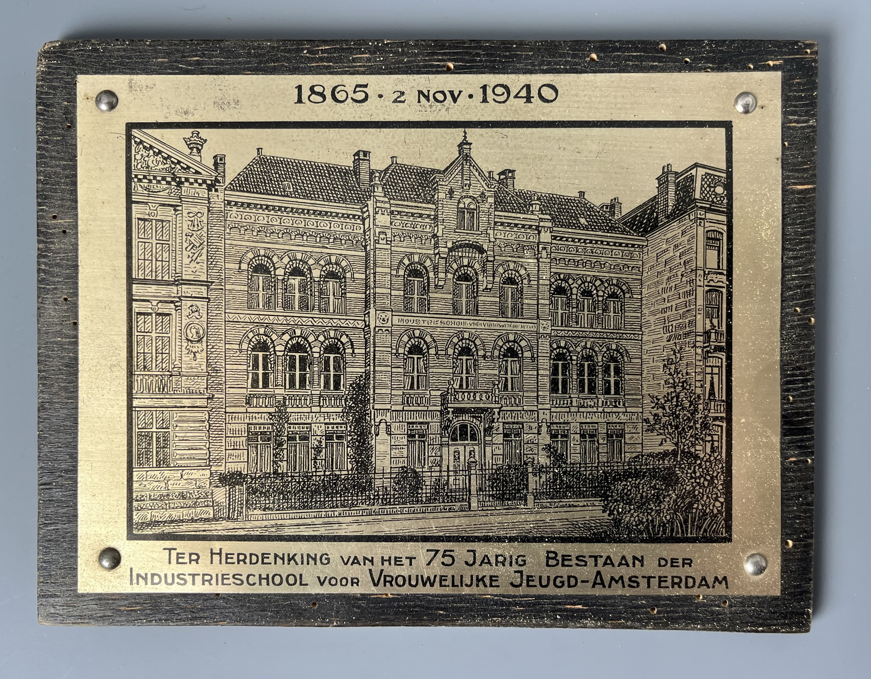 - Plaquette t.g.v. het 75-jarig bestaan Industrieschool voor Vrouwelijke Jeugd op de Weteringschans, 1940