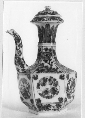 peterselie décor, op de buik 6 ronde medaillons, op de hals staande palmetten en bloemen