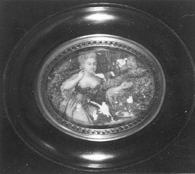 Ovaal, voorstelling van jongen en meisje spelend met twee apen. In een rechthoekige zwarte ebben lijst, met ovalen verdiepte insnijding en koperen gegraveerd inlegje- Trefwoorden