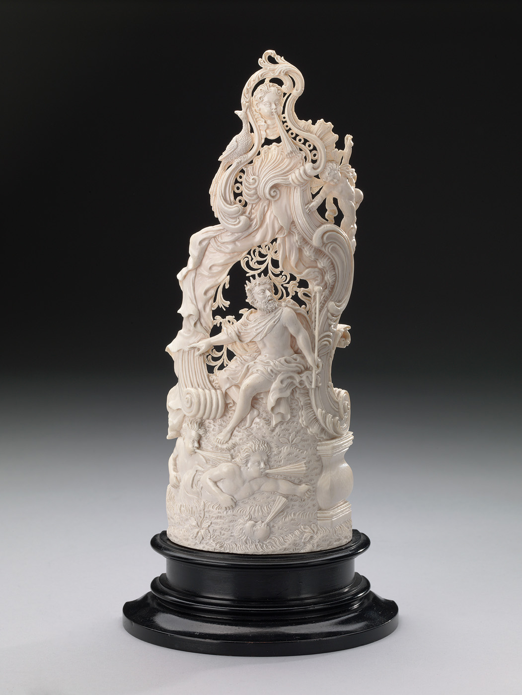 De verzameling van Abraham Willet telt een groot aantal voorwerpen van gesneden ivoor. Deze decoratieve reeks heeft als onderwerp de vier elementen: Water, Lucht, Aarde en Vuur. Links is de zeegod Neptunus weergegeven, hij symboliseert het water. Dan volgt Zeus, de heerser over het hemelrijk en daarmee de lucht. Derde in de rij is Ceres, die als godin van de vruchtbaarheid de aarde representeert. De Cyclopen, smeden van de godheid Hephaistos, symboliseren het vierde element: het vuur. ( Bert Vreeken)