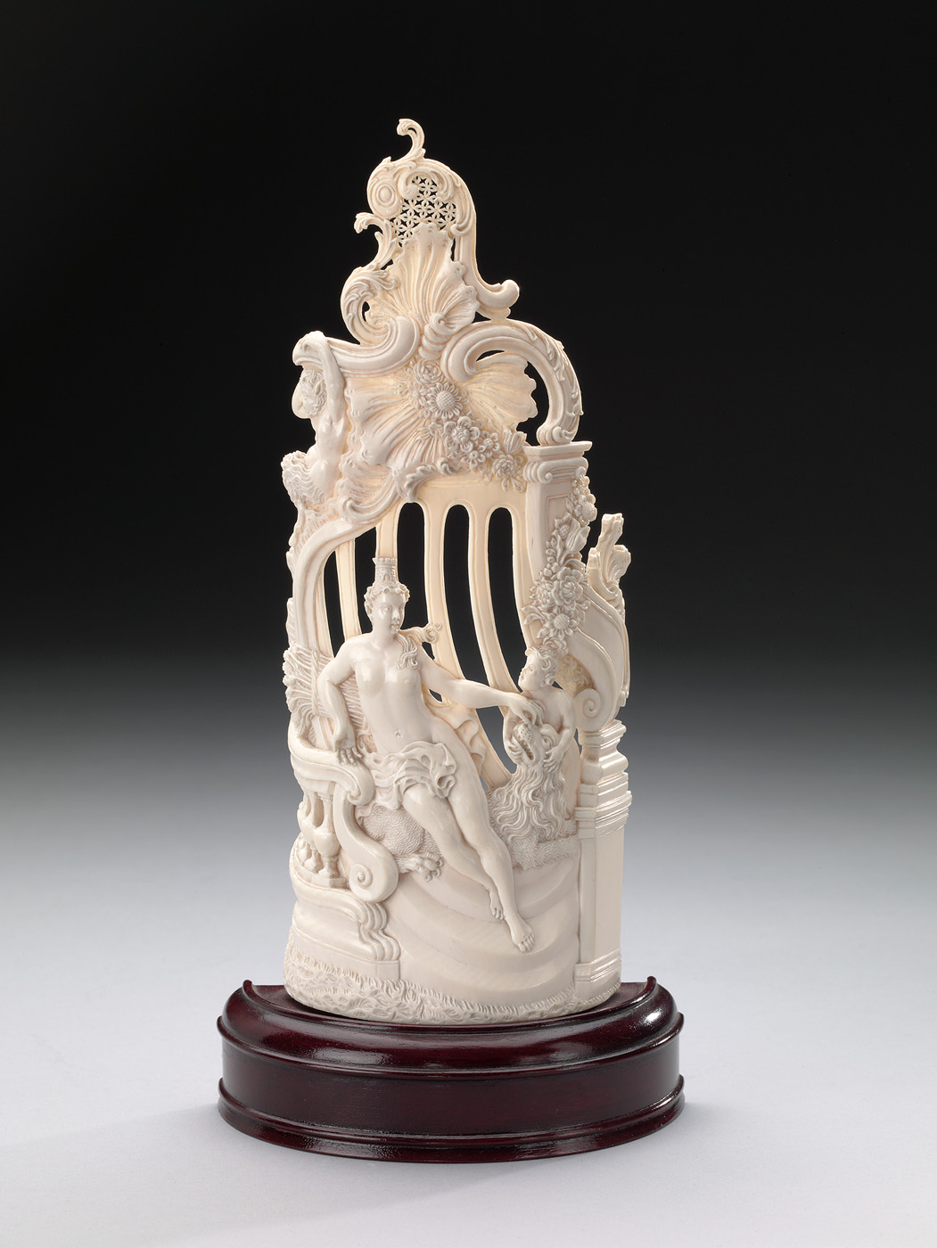 De verzameling van Abraham Willet telt een groot aantal voorwerpen van gesneden ivoor. Deze decoratieve reeks heeft als onderwerp de vier elementen: Water, Lucht, Aarde en Vuur. Links is de zeegod Neptunus weergegeven, hij symboliseert het water. Dan volgt Zeus, de heerser over het hemelrijk en daarmee de lucht. Derde in de rij is Ceres, die als godin van de vruchtbaarheid de aarde representeert. De Cyclopen, smeden van de godheid Hephaistos, symboliseren het vierde element: het vuur. ( Bert Vreeken)