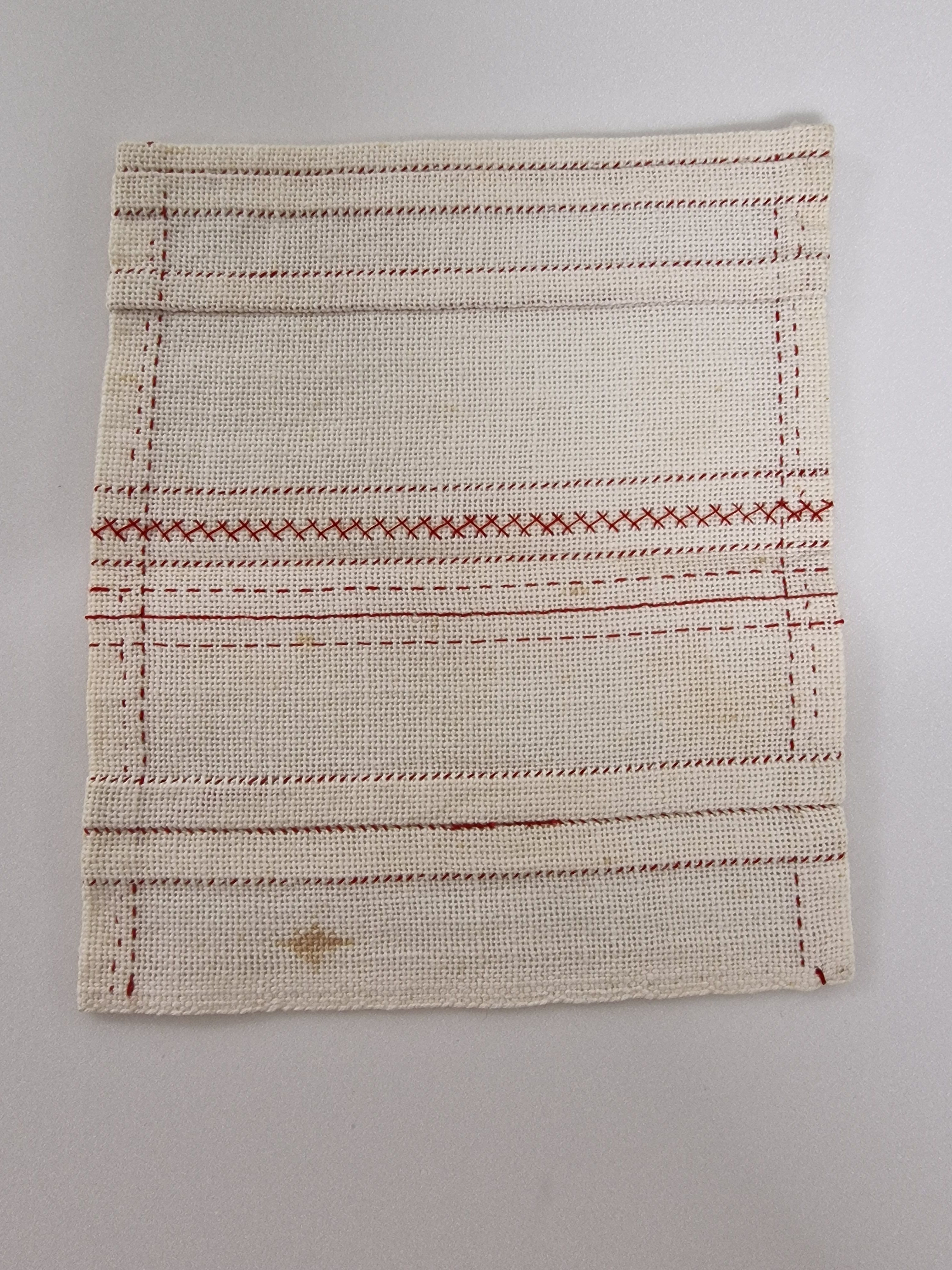 Deze nadenlap uit circa 1910 is onderdeel van een schenking met uitsluitend doeken uit de familie Kolder. De zusjes Adriana en Wilhelmina Kolder, respectievelijk coll.nr 7162-2 en coll.nr. 7162-3, maakten een soortgelijke doek. Of hier een derde borduurster –familie, moeder, klasgenootje, vriendin- of één van de zusjes nog eens aan het werk is geweest is niet bekend. De meisjes werden ondergebracht in de het Weeshuis der Nederduitsch Hervormde Diaconie. Daar kan ook de herkomst van deze doek gezocht worden. Het weeshuis bevond zich aan de Binnen Amstel, op de hoek van de Zwanenburgwal en de Zwanenburgstraat. In 1888 werd het pand afgebroken vanwege bouwkundige gebreken. Een nieuw onderkomen herrees op dezelfde plek. Een eeuw later moest het wijken voor de Stopera. Het weeshuis was, zoals de naam al doet vermoeden, bestemd voor kinderen van gereformeerde huize. De doek meet 18,5 x 15,5 cm en bestaat uit vijf lege stroken. Aan het invullen van deze stroken is de borduurster niet toegekomen. De meisjes Kolder wel. Zij lieten hier behalve sierrandjes, ook hun initialen achter.