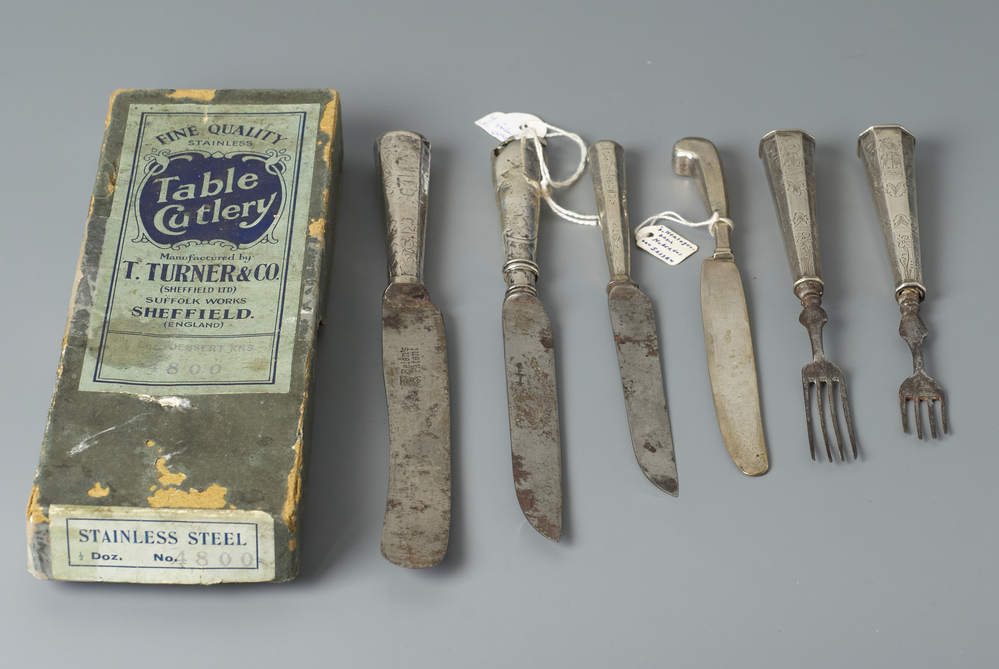 Kartonnen doos met deksel, tekst: FINE QUALITY STAINLESS TABLE CUTLERY, genummerd 4800.- Trefwoorden