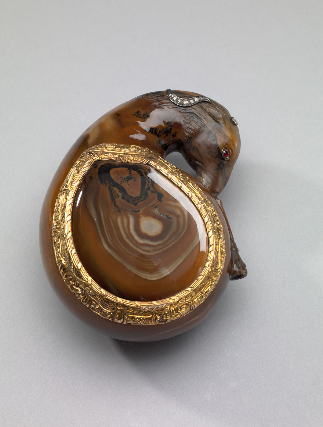 Snuifdozen waren een belangrijk kledingaccessoire in het 18e-eeuwse Europa en verfijnde eigenaars hadden dozen naar de laatste mode. Een complexe etiquette omringde het nemen van snuiftabak, een preparaat van tabak om door de neusgaten te inhaleren. De agaten snuifdoos heeft de vorm van een op een doedelzak spelende ramskop, versierd met diamanten en robijnen. Het gouden montuur van de deksel is versierd met rocailles en bloemen.