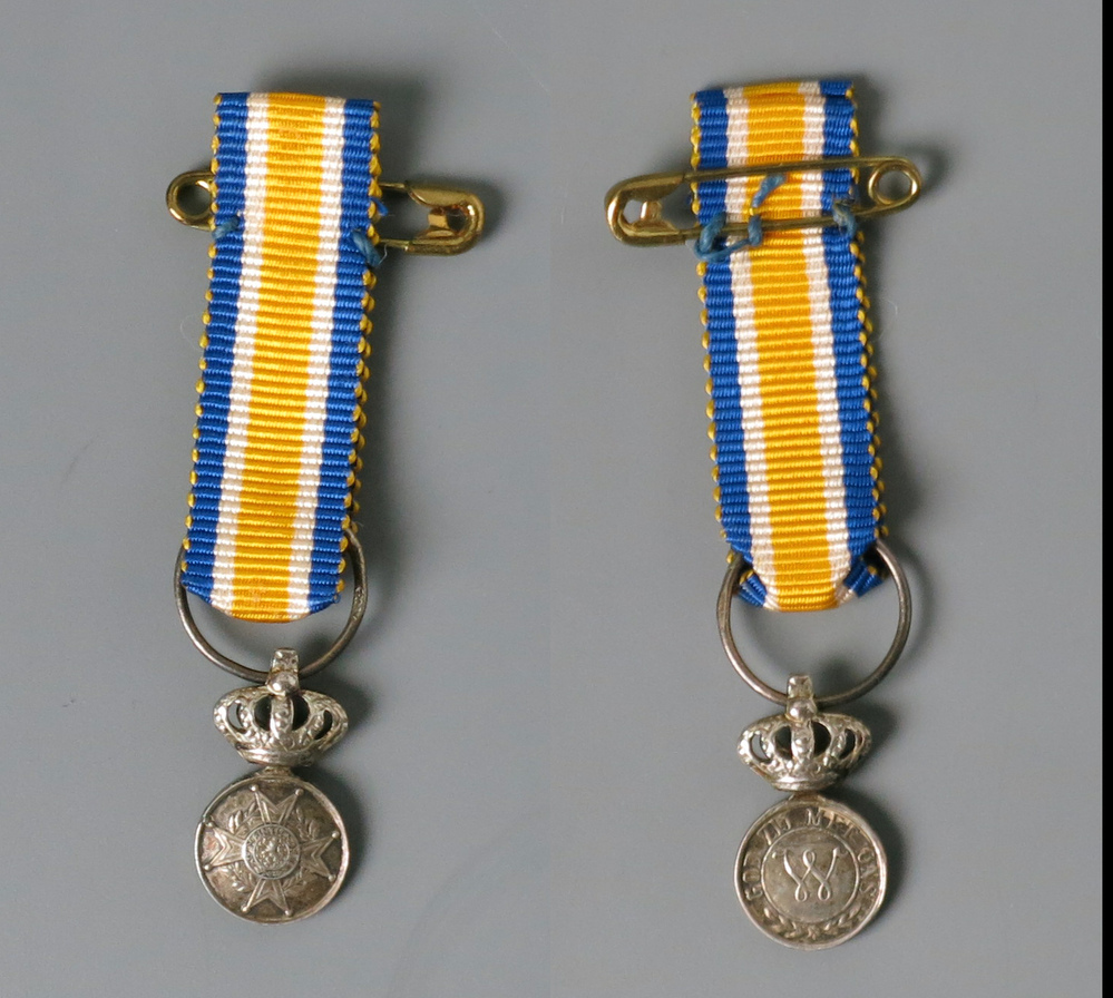 Een onderscheiding aan een origineel met oranje lint, een geelgouden Willemsorde. Op de voorzijde een letter W en het opschrift: 'God zij met ons' op de achterzijde een malthezer kruis met de Nederlandse leeuw en het opschrift rondom:' Je maintiendrai'. Hoogte van de onderscheiding incl oog: 3 cm, incl. lint: 6 cm., diameter: 13 mm.