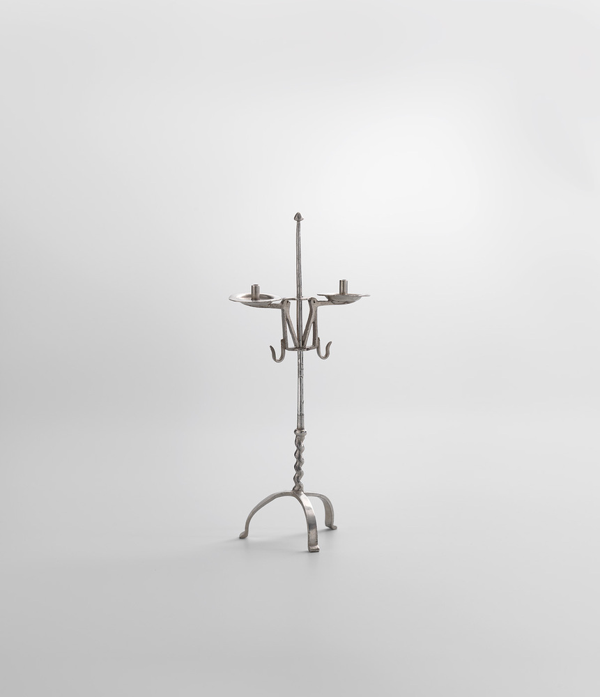 In hoogte verstelbare kaarsenhouder voor twee kaarsen op een driepoot .