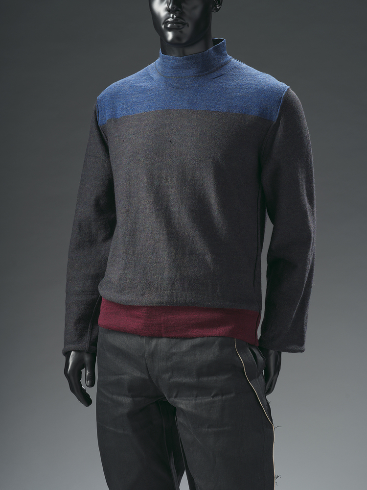 Wollen trui van het Japans modemerk Comme des Garçons (onder Rei Kawakubo), onder het submerk Comme des Garçons SHIRT. Het deconstructivistische karakter van dit modemerk is te zien aan de constructie van de trui. De trui is in tricotsteek (machinaal) gebreid, waarin delen van de achterkant van het tricot gebruikt is voor de voorkant van de trui. Ook zijn de binnen-naden van de trui te zien. De trui heeft een hoog opstaande kraag, oftewel een turtleneck. Geen coltrui, omdat de kraag niet is omgeslagen. De trui komt uit de collectie van Rob Kodijs.
