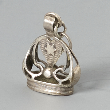 Smal ovaal signet met brede zetkast met geribdprofiel waarop kommavormig draadwerk waarin een schild met ster, vast oog met met drie ringen.- Trefwoorden