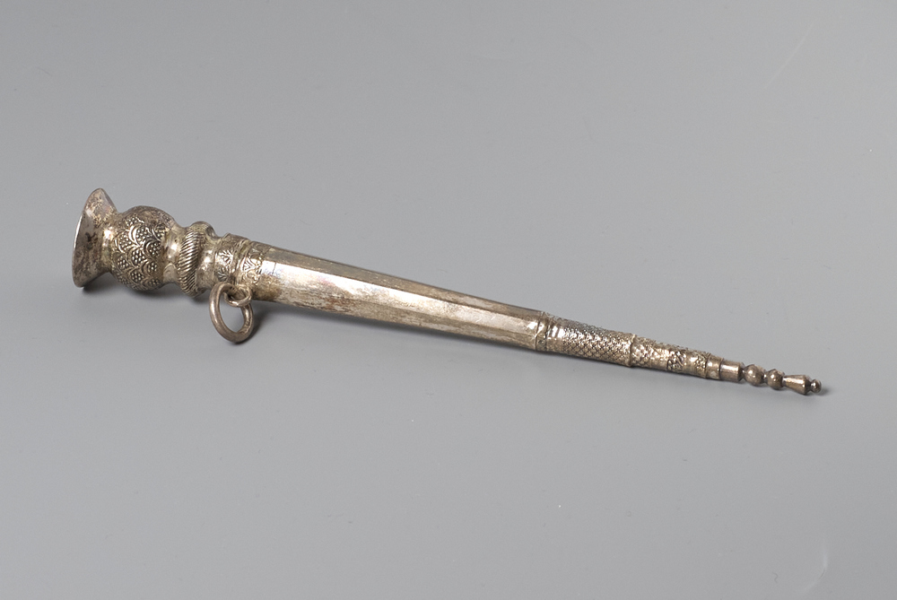 Taps toelopende koker met achtkantigdeel middenbovenzijde met een holle schotel met gat waaronder ring met ophangoog.- Trefwoorden