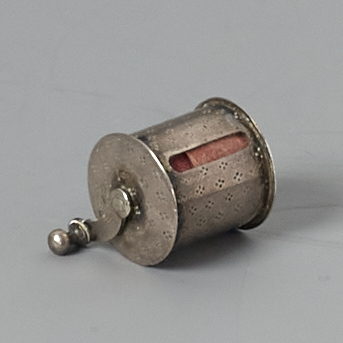 Roze meetlint in een cilindervormige tonnetje.- Trefwoorden