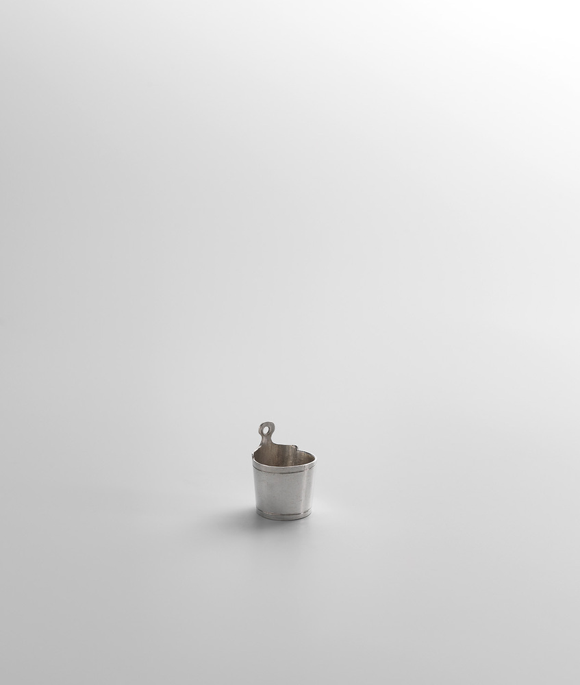 Vlakke bodem, gladde cilindrische wand een weinig uitlopend en voorzien van twee gegraveerde lijnen; de achterwand doorlopend in een schoudervorm met ophangoog.