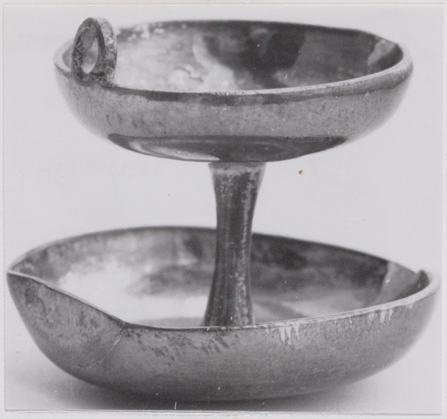 Grote en kleine schaal boven elkaar en beide met een schenktuit en afgeplatte zijde (olielamp).