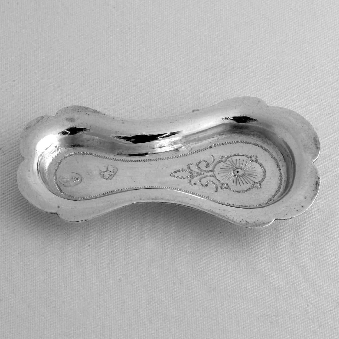 Langwerpige schotel ingesnoerd op de lange zijde, verdiepte bodem, vlakke rand, omtrek gecontourneerd, op bodem een randgravering met daarin een gestileerde bloem.