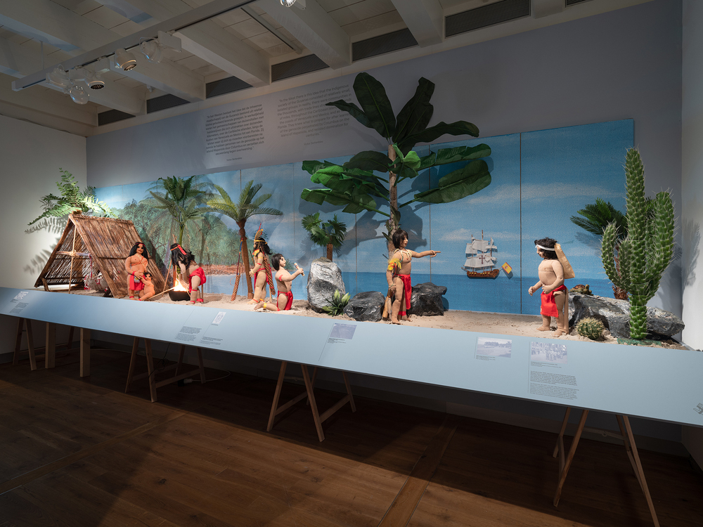 In de verte doemt het onheil op, in de vorm van een schip van de West-Indische Compagnie. De komst van de Nederlanders betekende voor de Inheemsen dwangarbeid, genocide, sterfte aan ziekten en verlies van hun cultuur, onder andere door gedwongen kerstening. De Inheemse mensen verzetten zich tegen kolonisatie en slavernij en steunden tot slaaf gemaakte mensen die ontsnapten van de plantages.