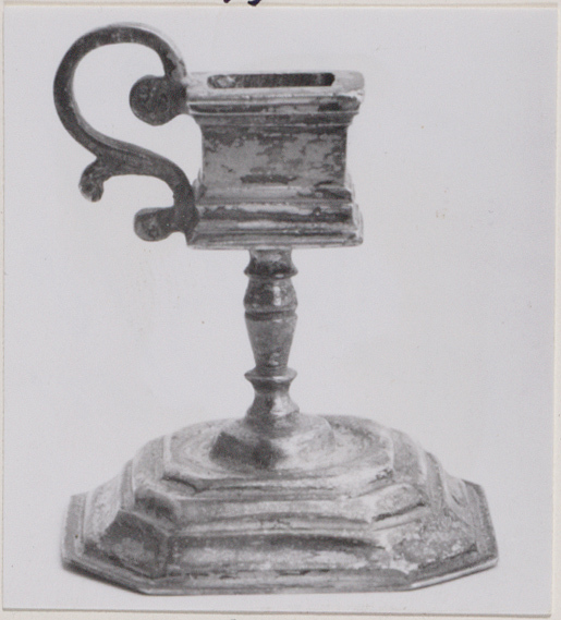 Vierkante geprofileerde voet, waarop rechthoekige houder met een gekruld oor.