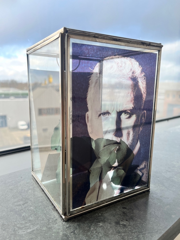 Glazen herinneringskastje voor Peter R. de Vries, 2021 glas, messing, kunststof overdracht 2024-07-18 inv.nr. 7742 in depot Neergelegd in de Lange Leidsedwarsstraat in de nadagen van de moord op de bekende misdaadverslaggever.