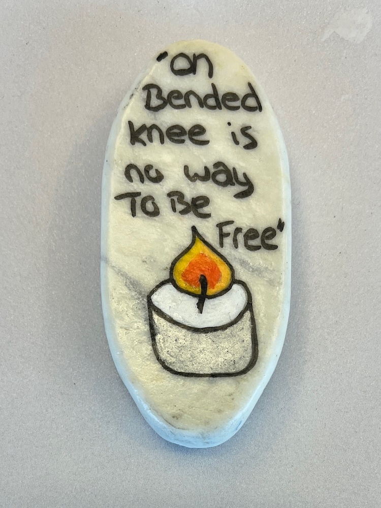 Ovale witte 'steen' (van kunststof) met aan voorzijde een citaat "On bended knee is no way to be free" met daaronder een kaarsje getekend. aan achterzijde, ook in zwart de tekst "Peter R. de Vries/ 1956 [hartje] 2021".