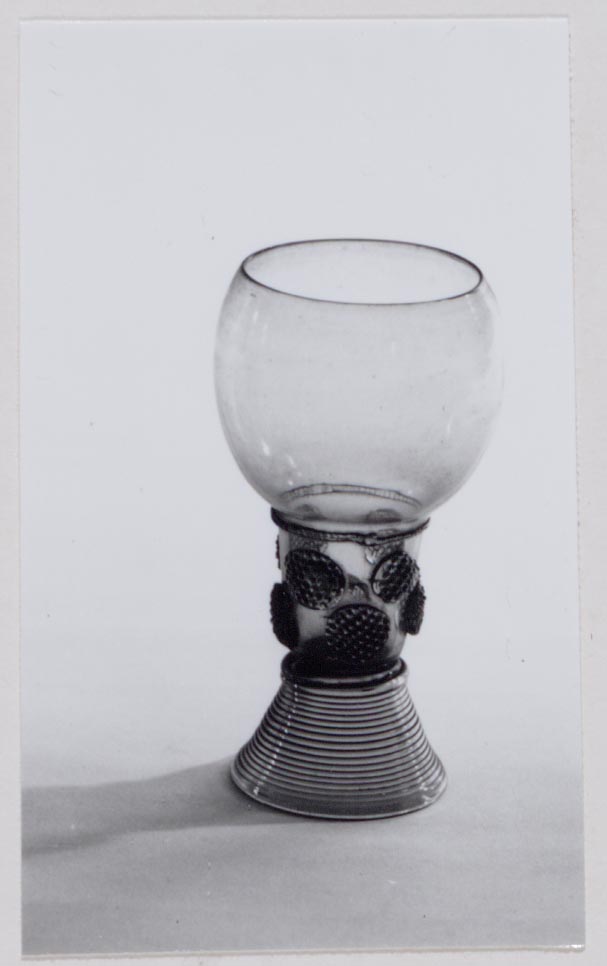 Helder kleurloos, groen getint glas. Ingestoken bodem. Conische voet van gesponnen glasdraad. Cilindrische schacht met twee rijen braamnoppen, aan één stuk geblazen met bolvormige kelk. Geribde glasdraad op overgang schacht en kelk.- Trefwoorden