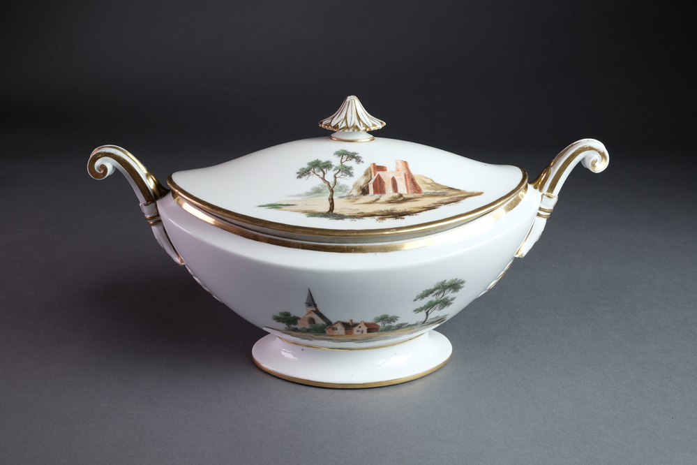 Terrine en deksel met afbeeldingen van historische dorpsgezichten, huizen en gebouwen.- Trefwoorden