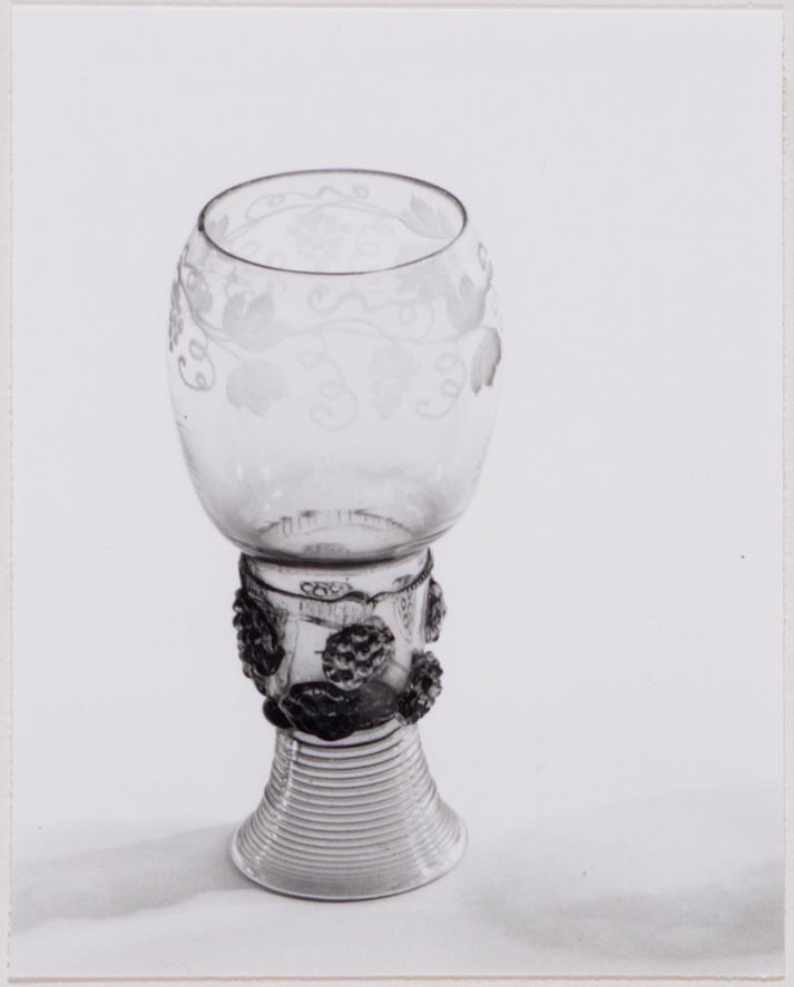 Helder lichtgroen glas. Ingestoken bodem. Conische voet van gesponnen glasdraad. Cilindrische schacht met twee rijen braamnoppen, aan één stuk geblazen met eivormige kelk. Geribde glasdraad onder overgang schacht en kelk. Rondom kelk druivenranken.- Trefwoorden