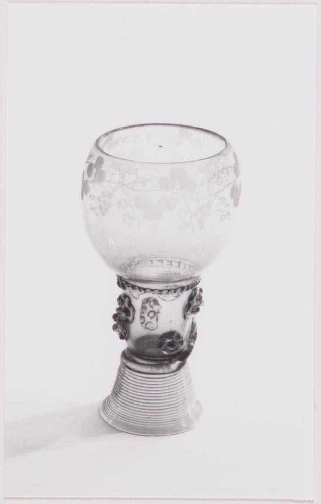Helder lichtgroen glas. Ingestoken bodem. Conische voet van gesponnen glasdraad. Cilindrische schacht met twee rijen braamnoppen, aan één stuk geblazen met eivormige kelk. Geribde glasdraad op overgang schacht en kelk. Rondom kelk druivenranken.- Trefwoorden