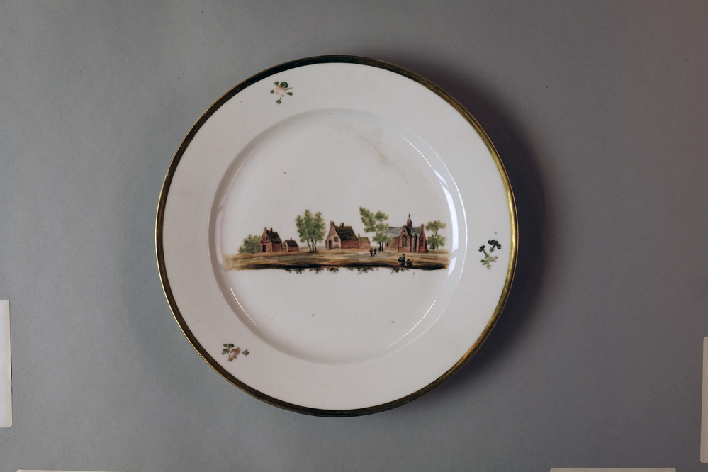 Bord met een afbeelding van een historisch dorpsgezicht of gebouw.- Trefwoorden